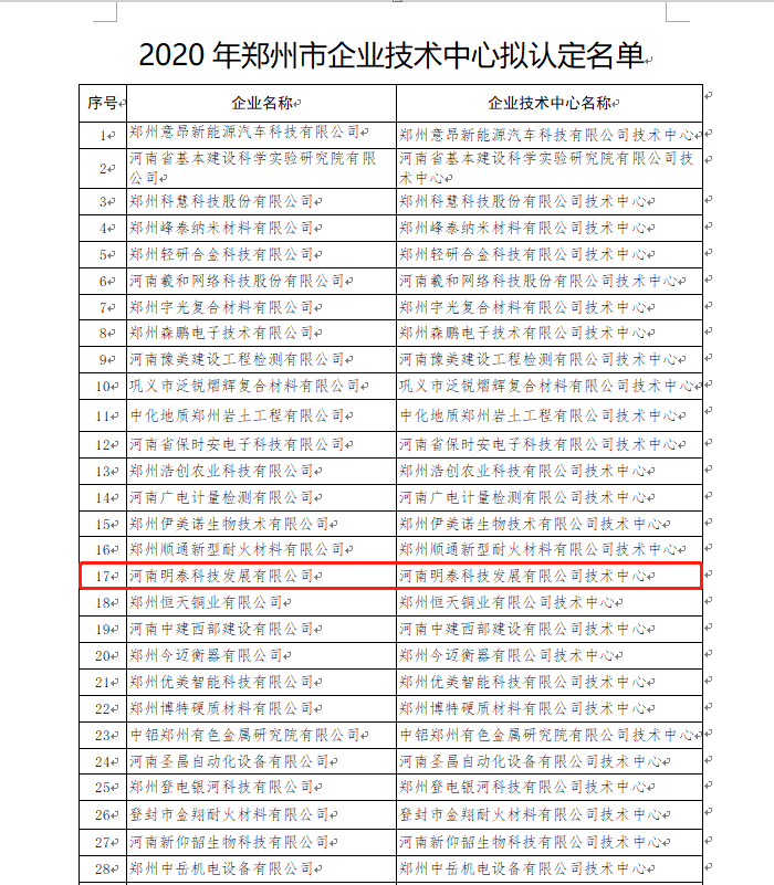 2020年8月4日,經(jīng)企業(yè)自主申報(bào)、縣(市、區(qū))推薦、專家評(píng)審和現(xiàn)場核查,河南明泰科技發(fā)展有限公司等61家企業(yè)符合《鄭州市認(rèn)定企業(yè)技術(shù)中心管理辦法》(鄭工信[2014]2號(hào))所規(guī)定的基本條件,擬認(rèn)定為2020年度鄭州市企業(yè)技術(shù)中心,鄭州市工業(yè)和信息化局將名單予以公示。