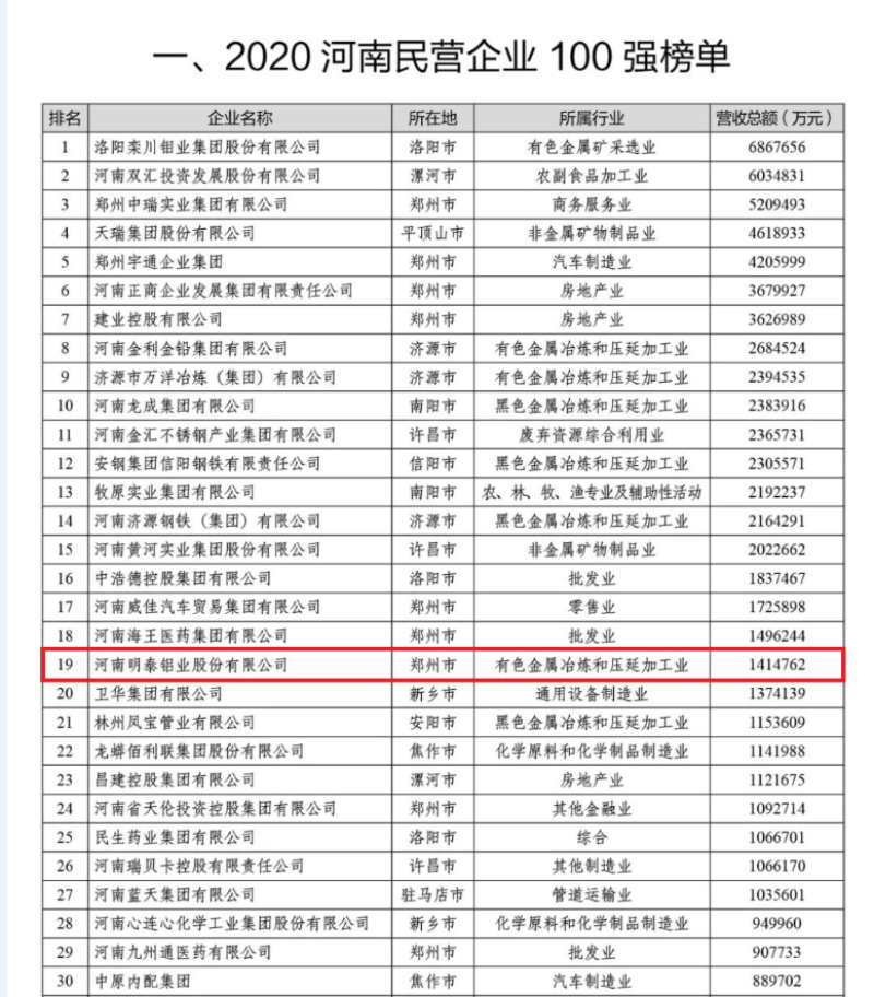 發(fā)布會上,明泰鋁業(yè)憑借141.4億的營業(yè)總額再次入選2020河南民營企業(yè)100強榜單和2020河南民營企業(yè)制造業(yè)100強榜單,分別位列第19位、第11位。近年來,明泰鋁業(yè)不斷深化產(chǎn)業(yè)結(jié)構(gòu)與升級,主動履行社會責(zé)任,加快企業(yè)邁向高質(zhì)量發(fā)展的步伐。又一次榮登雙百強榜單,是社會各界對明泰鋁業(yè)近年來快速發(fā)展的肯定,也標(biāo)志著明泰鋁業(yè)在全省民營企業(yè)中的重要作用和地位。