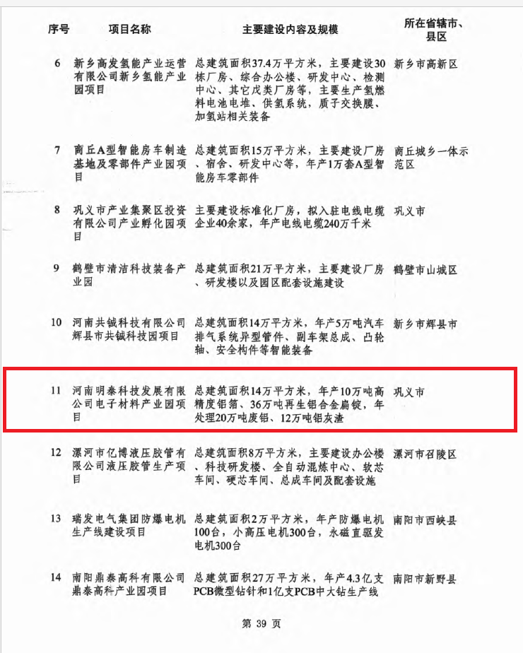 近日,河南省發(fā)改委發(fā)布2021年河南省重點建設(shè)項目名單,名單共列項目1371個,總投資4.4萬億元,年度計劃完成投資1.1萬億元,涵蓋新型基礎(chǔ)設(shè)施、新型城鎮(zhèn)化、重大基礎(chǔ)設(shè)施、產(chǎn)業(yè)結(jié)構(gòu)優(yōu)化升級、創(chuàng)新驅(qū)動、生態(tài)環(huán)保、社會民生七大領(lǐng)域。其中,明泰科技電子材料產(chǎn)業(yè)園項目榜上有名。